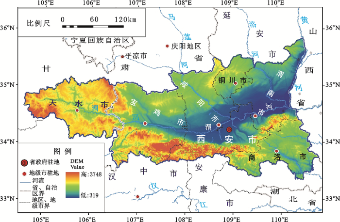 关中-天水经济区,包括陕西省西安、铜川、宝鸡、咸阳、渭南、杨凌、商洛(部分区县 )和甘肃省天水所辖行政区域(共65个县),见图1,总面积约8.01万km2,2008年末总人口为2 863.33万人。关中-天水经济区地势总体以渭河河谷为中轴线,南部和北部高,中部低,地形呈东西槽状展布,海拔在400~3 700 m之间。陇山南北纵贯天水与关中之间,形成渭河上狭窄的谷地-宝鸡峡。在宝鸡峡以西为比较狭窄的渭河河谷,渭河河谷以北是黄土丘陵区,以南则是以尽皇山、云雾山、景东梁为主的西秦岭山地。在宝鸡峡以东,形成由西向东逐渐变宽的“喇叭状”的关中盆地,沿渭河有渭河冲积平原,地势平坦、由西向东降低。自渭河冲积平原向南、向北,海拔逐渐升高;冲积平原以北依次是渭北黄土台塬、北山;以南依次是渭河南部黄土台塬和秦岭北坡山地。本区大部分属大陆暖温带半湿润气候。年均气温在11~13℃之间,降水量约在500~900 mm之间,多年平均降水量约550 mm。天水西北、关中平原北部及北山大部分地区降水量较低,而南部的秦岭、西秦岭等山地降水量均较高。本区地跨长江、黄河两大流域,以秦岭、西秦岭为界,北部主要为黄河支流的渭河流域,南部分属长江支流的嘉陵江流域和汉江流域。本区最大的河流是渭河,东西横贯本区中部,其支流主要分为南北两部分,其中北部渭河主要支流有葫芦河、千河、泾河、洛河等;南部渭河主要支流有沣河、涝河、黑河、浐河和灞河等(见图1)。
