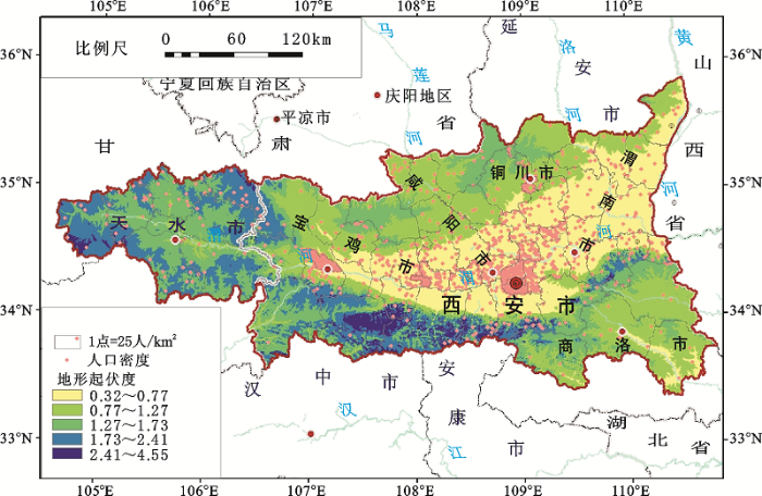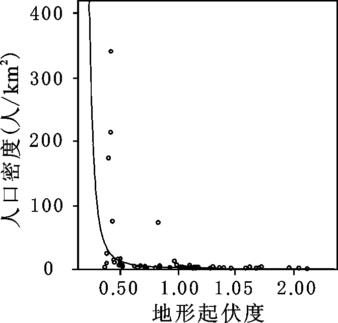 4) 地形起伏度对区域人口分布有较强的影响,关中-天水经济区近90%的人口居住在地形起伏度小于1.5的地区,人口密度与地形起伏度的曲线拟合度非常高。